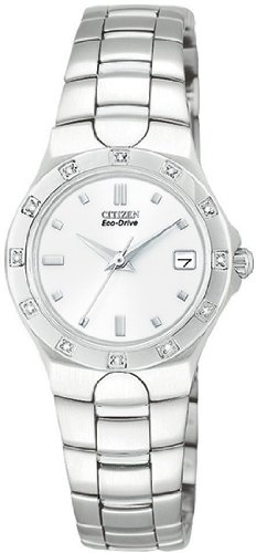 Sleekly styled and sparkling with 12 diamonds embedded into the bezel, the silver-tone Citizen Corso Eco-Drive stainless steel women's watch makes a sophisticated complement to professional dress as well as sultry formal couture. This mid-sized, round watch offers a stainless steel bracelet band thaCitizen Women's EW0730-54A Eco-Drive Corso Diamond Accented Watch Do not Miss!! Sleekly styled and sparkling with 12 diamonds embedded into the bezel, the silver-tone Citizen Corso Eco-Drive stainless steel women's watch makes a sophisticated complement to professional dress as well as sultry formal couture. This mid-sized, round watch offers a stainless steel bracelet band tha... Citizen Women's EW0730-54A Eco-Drive Corso Diamond Accented Watch