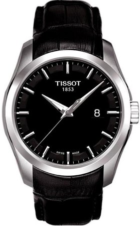 Stainless steel case with a black leather strap. Fixed stainless steel bezel. Black dial with silver-tone hands and index hour markers. Minute markers around the outer rim. Date display appears at the 3 o'clock position. Quartz movement. Scratch resistant sapphire crystal. Solid case back. Case diamTissot Couturier Black Dial Mens Watch T0354101605100 Do not Miss!! Stainless steel case with a black leather strap. Fixed stainless steel bezel. Black dial with silver-tone hands and index hour markers. Minute markers around the outer rim. Date display appears at the 3 o'clock position. Quartz movement. Scratch resistant sapphire crystal. Solid case back. Case diam... Tissot Couturier Black Dial Mens Watch T0354101605100